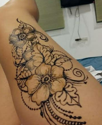 تعتبر هذه الرسمه من النقوش الرائعه و الجميله التي تزيد من جمال الفخذ و تعطيه اطلاله مغريه و مليئه بالانوثه عن طريق نقش زهره كبيره الحجم مع اوراق كثيره و تزينها بالخطوط الهندسيه المموجه .