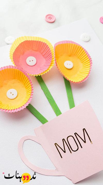 - ورده ورقيه : احضر مجموعه من الاطباق الخاصه بالكب كيك بالوان مختلفه و ثقبها من المنتصف و تثبيت عصاه ن المنتصف و تزينها من المتصف بشكل جمالي مع وضع كارت جانبها عليه كلمات خاصه بالام .