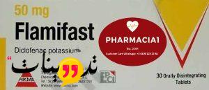 فلاميفاست الاسم العلمي له ديكلوفيناك و هي المادة الفاعلة و التي تعمل بدورها على تثبيط تصنيع مادة البروستاجلاندين المسئولة عن حدوث الآلام و الإلتهابات حيث ان مادة الديكلوفيناك بوتاسيم تعد من عائلة العقارات المسكنة للالام و الالتهابات الغير ستيرودية .و دواء فلاميفاست عبارة عن اقراص جيلاتينية صلبة يتم تناولها عن طريق الفم .و يعد من اهم دواعي استعمال فلاميفاست هي علاج الحد من الام التهابات العظام و الام الظهر و التهابات المفاصل كما تتعدد دواعي استعمال فلاميفاست لاكثر من ذلك نظرا لاعتباره مسكن للالام بصفة عامة و خافض للحراراة .