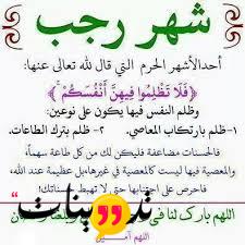 صور عن شهر رجب : قال تعالي (إِنَّ عِدَّةَ الشُّهُورِ عِندَ اللّهِ اثْنَا عَشَرَ شَهْراً فِي كِتَابِ اللّهِ يَوْمَ خَلَقَ السَّمَاوَات وَالأَرْضَ مِنْهَا أَرْبَعَةٌ حُرُمٌ ذَلِكَ الدِّينُ الْقَيِّمُ فَلاَ تَظْلِمُواْ فِيهِنَّ أَنفُسَكُمْ ) {التوبة: 36} فضل الله تعالي بعض الايام و الاشهر و الليالي عن بعضها البعض فيعتبر شهر رجب من الاشهر الحرم الاربعة التي نهي الله تعالي فيها الظلم او ارتكاب اي فعل يغضب الله عز وجل و يأمر فيها بالذكر و الصلاه و التقرب الي الله عز وجل , و يقول أحد الاحاديث ” إن فى الجنة نهرا يقال له: رجب، أشد بياضا من اللبن وأحلى من العسل، من صام من رجب يوما سقاه الله من ذلك النهر ” و هذا الحديث يعتبر من الاحاديث الضعيفة .