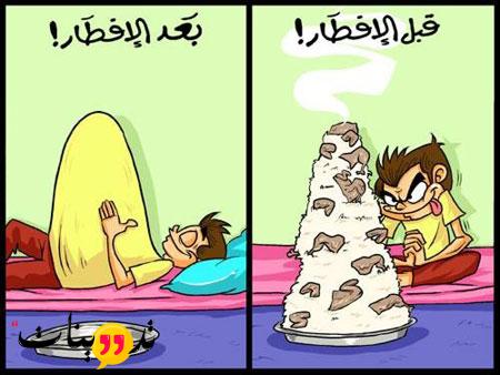 يقوم بعض الناس بأكل الكثير من الطعام و يشربون كثيرا اعتقادا بأن ذلك سوف يشبعهم ولكن هذا اعتقاد خطأ لان جسم الانسان يأخذ ما يفيده فقط من الطعام ولا يحتاج الي الكثير و لذلك يشعر الانسان بالجوع وقت الصيام مهما أكل في السحور و إليكم بعض الصور المضحكة التي تتحدث بشكل كوميدي عن هذا الموقف