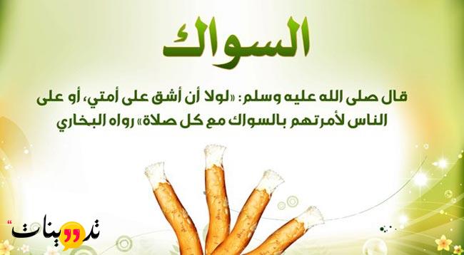 - و قد أوصى النبى عليه أفضل الصلاة و السلام بأستخدام السواك وذلك من أجل ما يحمله من فوائد متعددة حيث أنه قال عليه الصلاة والسلام: (لَوْلَا أَنْ أَشُقَّ عَلَى أُمَّتِي أَوْ عَلَى النَّاسِ لَأَمَرْتُهُمْ بِالسِّوَاكِ مَعَ كُلِّ صَلَاةٍ).